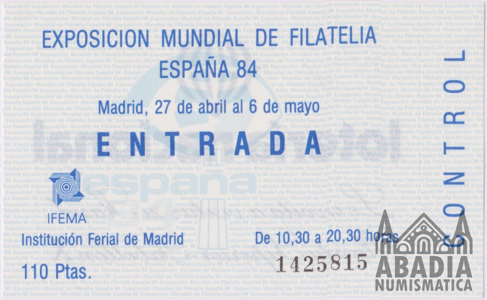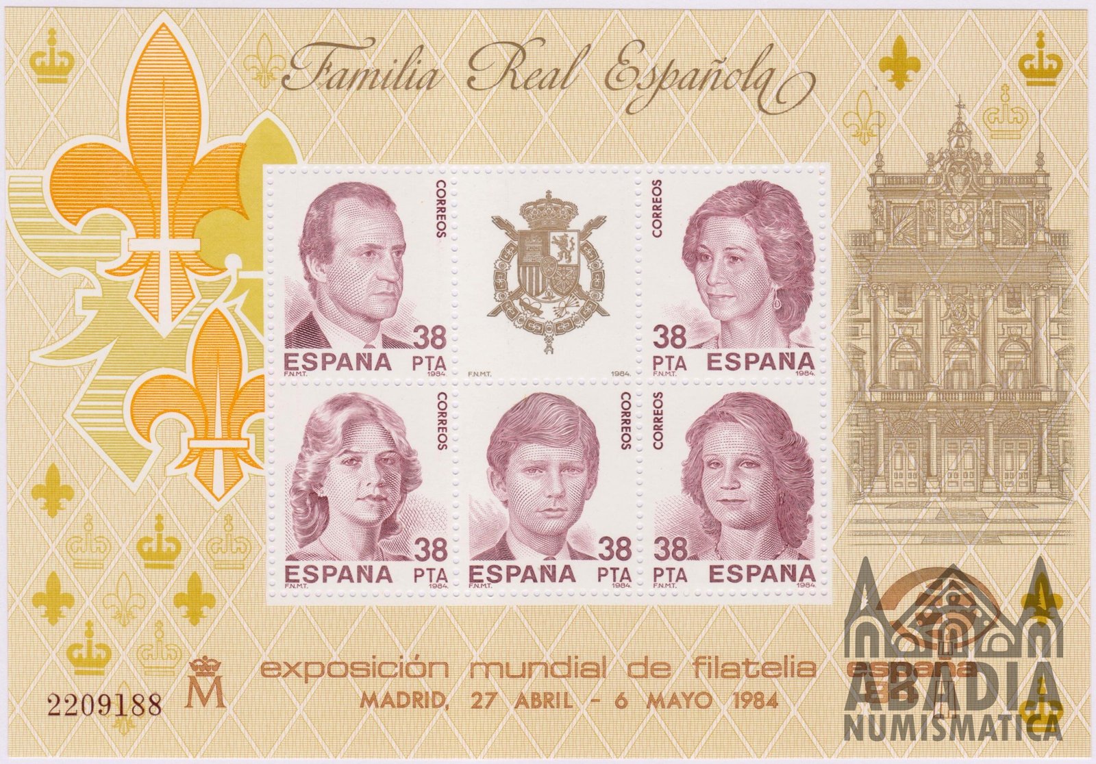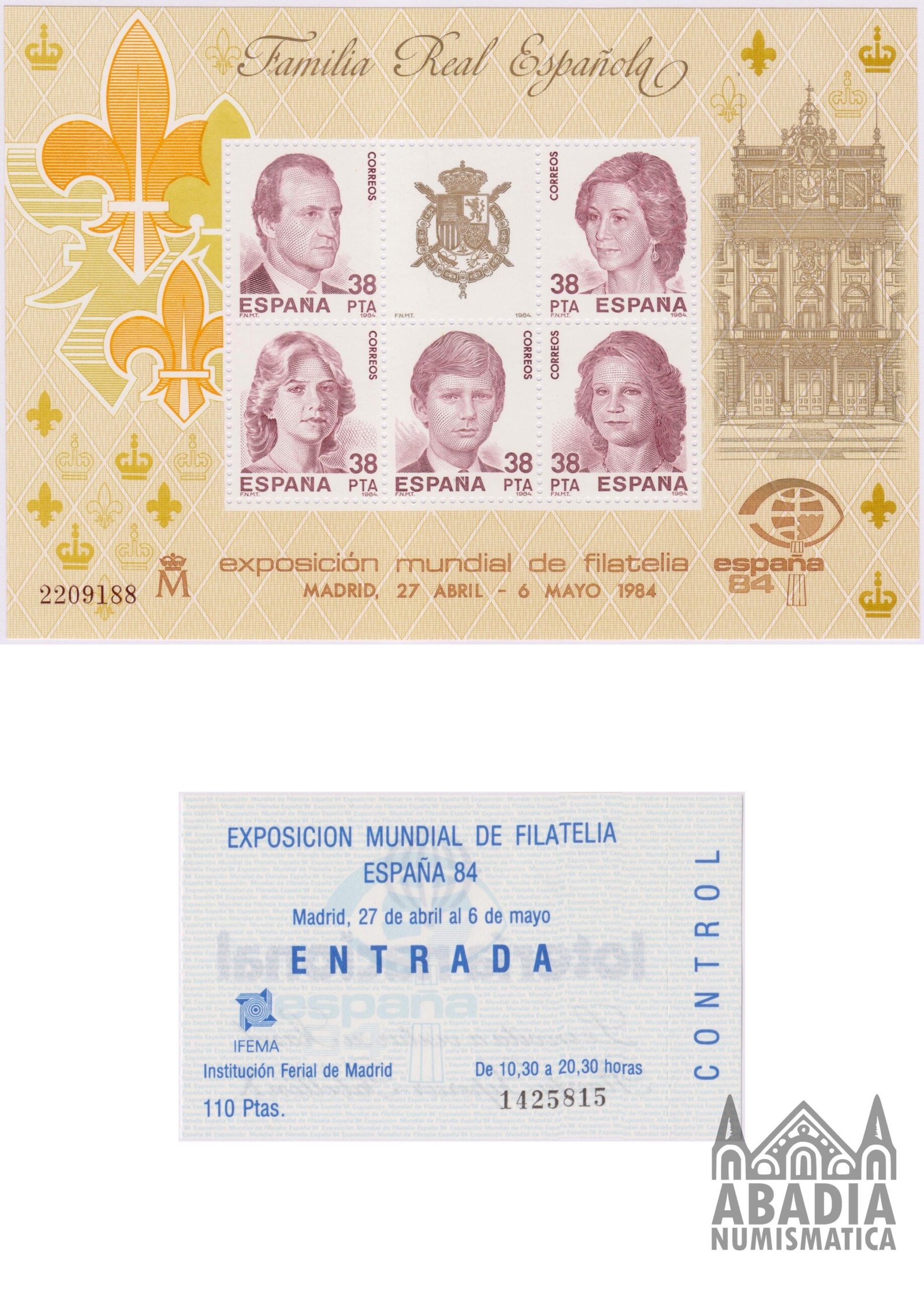 Pieza especial de filatelia española: Hoja bloque de 5 sellos de la Familia Real Española (1984), junto con una entrada original del evento España 84.