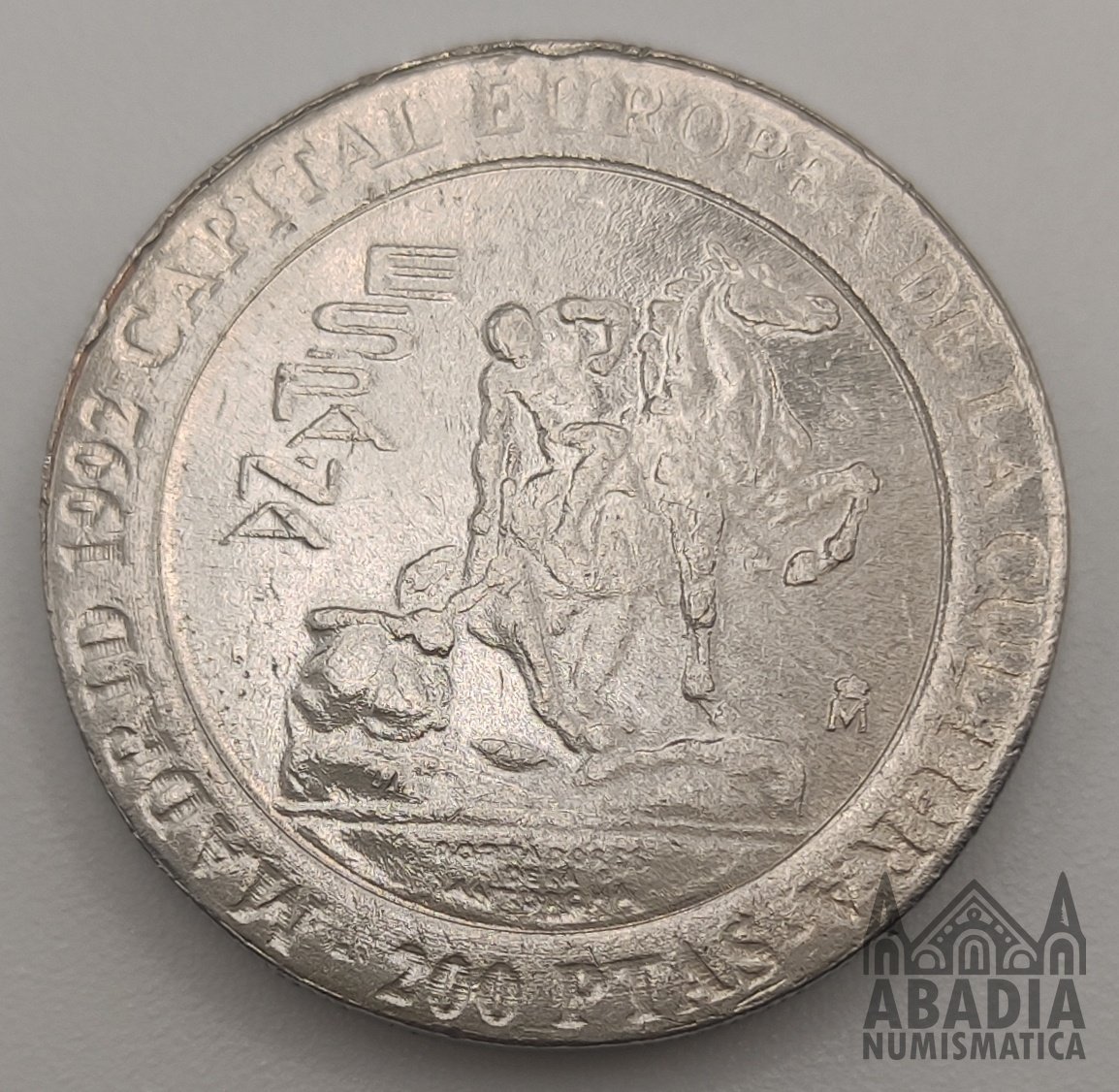 Moneda falsa de época de 200 Pesetas con anverso 1992 y reverso 1996, formando una pieza híbrida.